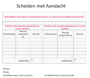 De inboedel verdelen na de scheiding kan in overleg, zonder een inboedellijst of juist met. Willen jullie duurzame afspraken maken zonder gedoe achteraf? Dan is het handig om bovenstaande inboedellijst te gebruiken. In de praktijk blijkt namelijk dat stellen die uit elkaar gaan vaak niet meer precies weten wat ze over de inboedel hebben afgesproken. Met alle gevolgen van dien.